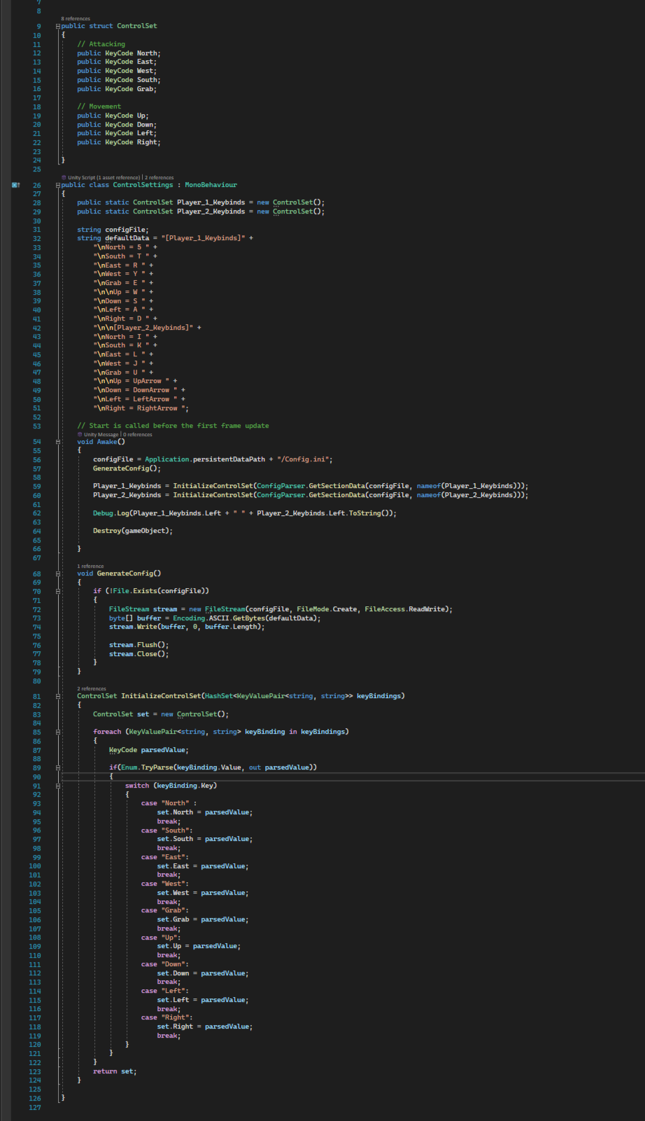 This game was my first introduction to coding; my most recent development allows the player to create custom controls for the moves they want and save them for the next time they load up the game. Here is a brief snapshot of the code.