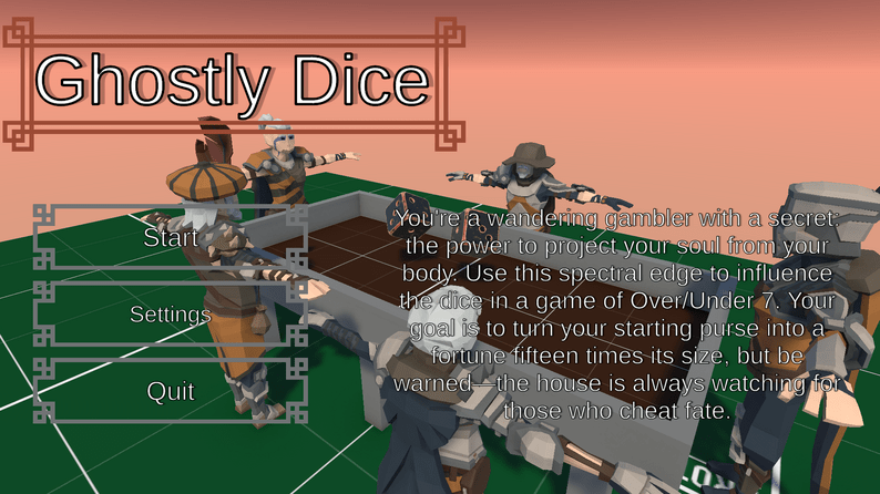 In Ghostly Dice you play as a wandering gambler that has spectral powers that he uses to rig games of “chance” to win big. Your goal is to make a 15x profit without raising too much suspicion or you will be kicked out of this game.